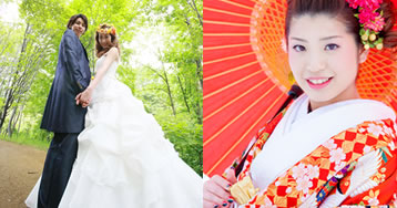 撮影は四季を問わず、洋装和装も問いません。ウエディングドレス専門ショップの高品質なウエディングドレスの中から、花嫁さんにぴったりの一着を身にまとって最高の結婚写真を作っていきましょう。